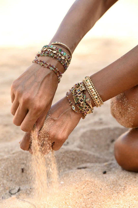 Bracelet manchette en laiton doré 24 cts 1 micron, serti de pierres fines naturelles multicolores: Grenat, Améthyste, Péridot, Diopside, Citrine, Topaze blanche. Longueur réglable de 15cm à 20cm par une...