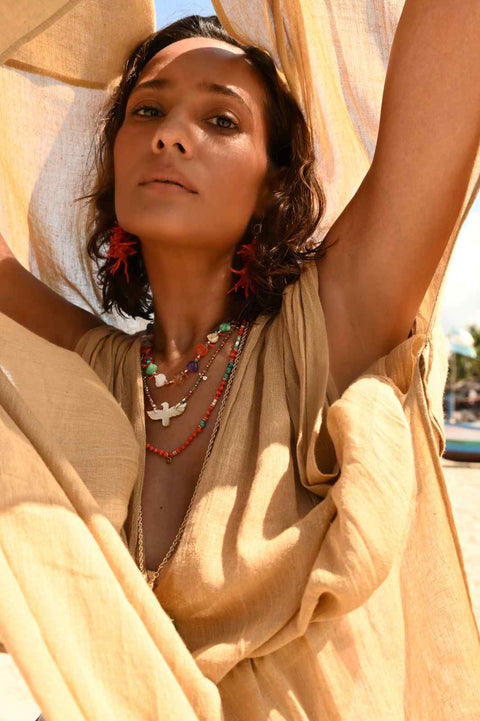 Collier avec pendentif croix en Laiton doré à l'or 24 cts, 1 micron, sertie de pierres Grenats naturels. Cordon de soie crocheté à longueur réglable par des noeuds coulissants. Finitons...