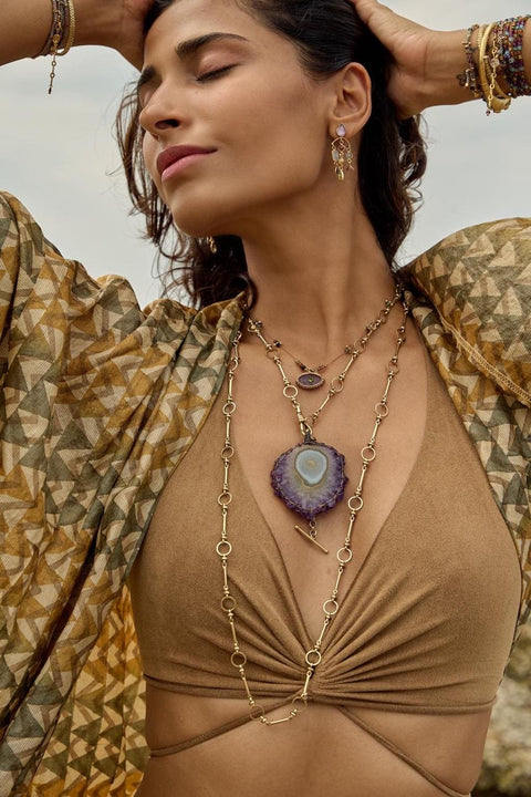 Collier avec pendentif multi-pierres en argent 925 plaqué or 24 cts, serti de 49 pierres naturelles en Grenat, Améthyste, Iolite, Labradorite, Perle d'eau douce, Citrine, Péridot. Ce pendentif est un...