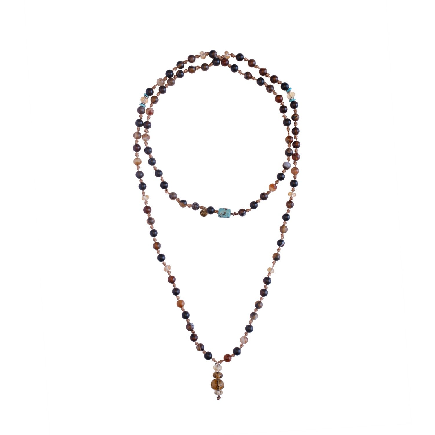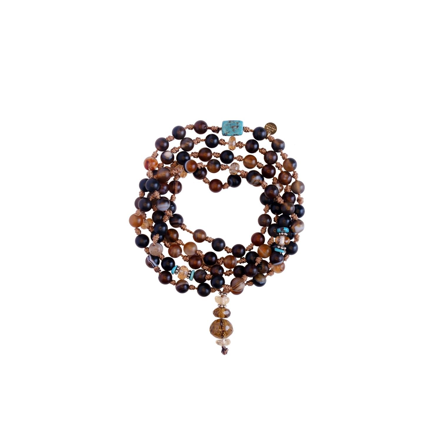 Sautoir Mala ethnique et bohème en perles d'Agates naturelles, en Turquoises naturelles d'Arizona, en Quartz et en argent 925. Chaque collier comporte environ 85 perles montées sur un fil torsadé noué...