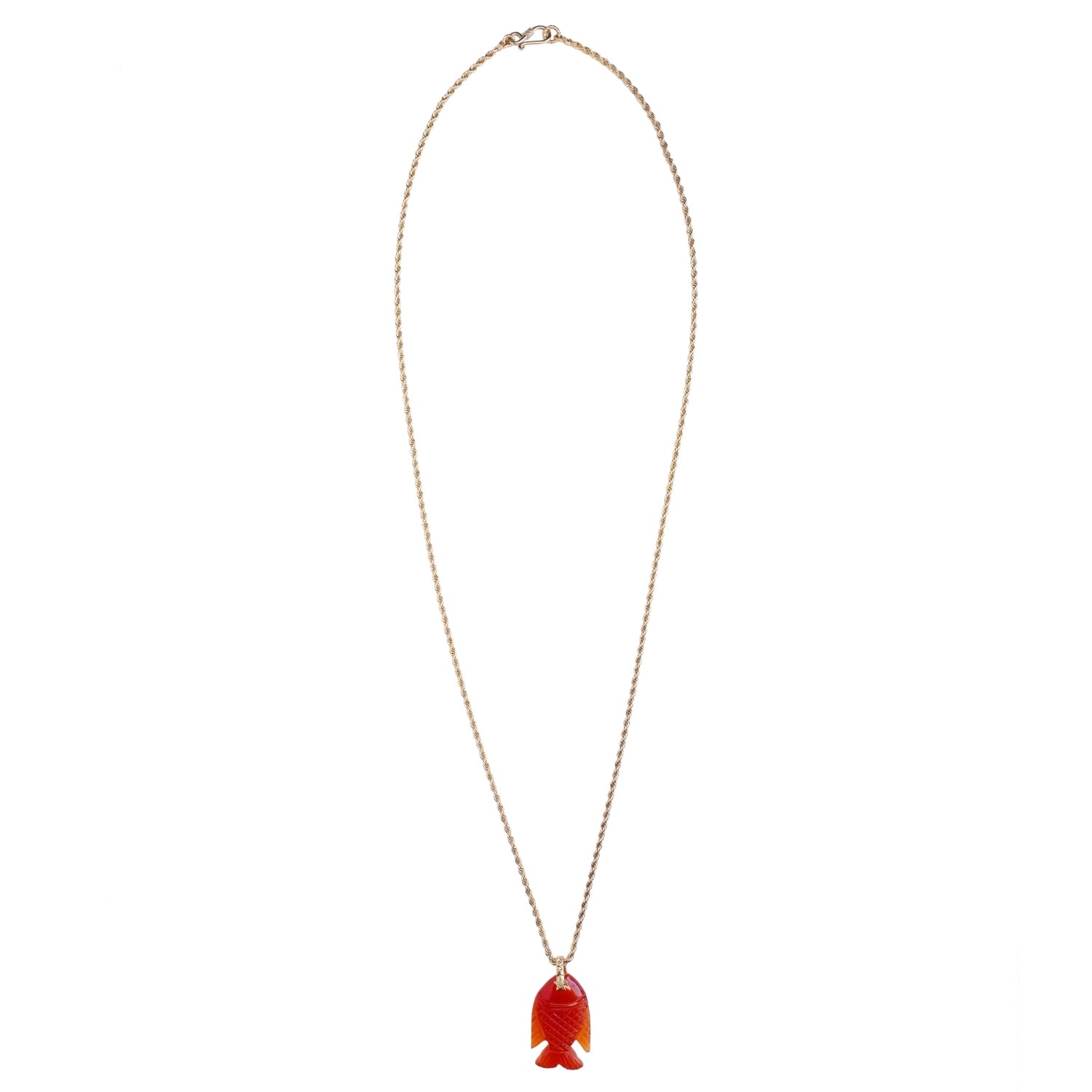 COMING SOON...PRE COMMANDE Collier avec pendentif en forme de poisson porte-bonheur, en pierre Cornaline naturelle finement sculptée à la main, monté sur une bélière en forme d'étoile sertie d'une Topaze....
