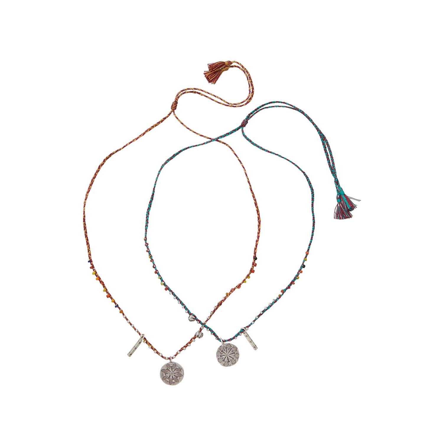 Collier tressé avec médaille porte-bonheur gravée soleil en argent 925, perles de rocaille anciennes multicolores.