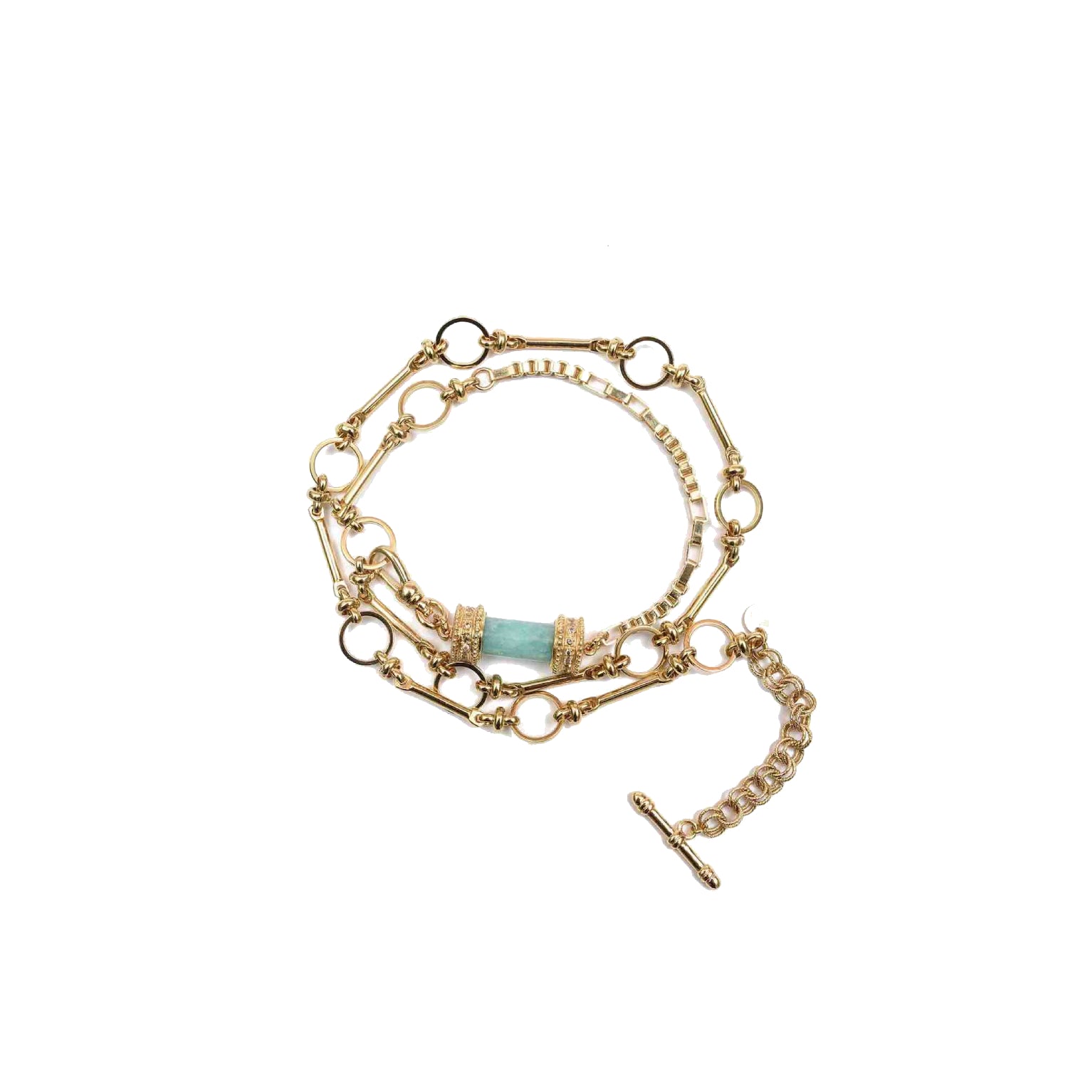 Bracelet multi-tours pouvant se porter en collier, avec pendentif en pierre fine naturelle Amazonite et Zircons naturels champagne, en laiton doré 24 carats, 1 micron. Longueur réglable à 48cm, 51cm puis...