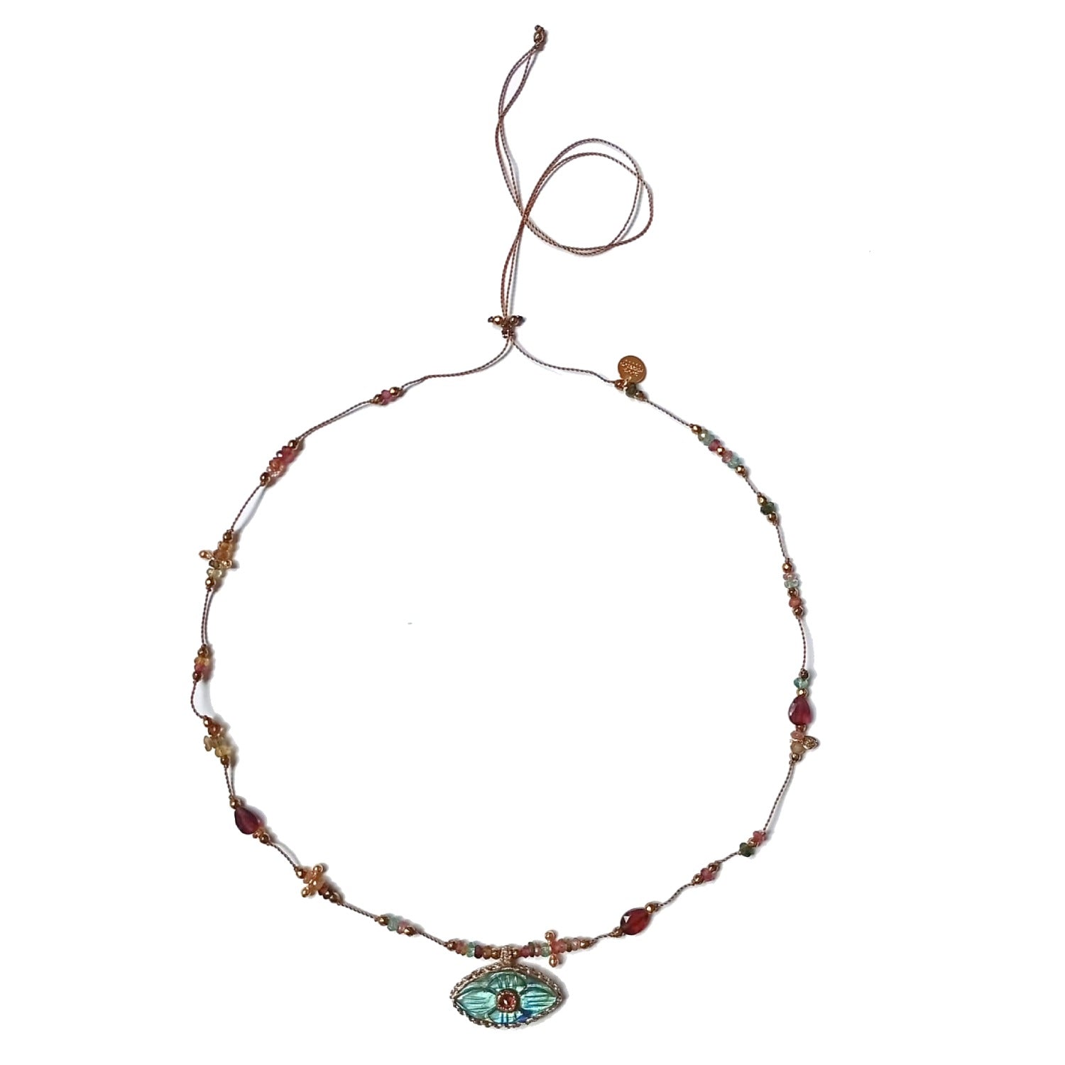 Collier en Rubis zoisite, Grenat et Hématites, avec un pendentif amulette Oeil porte-bonheur en Chrysoprase et Grenat, serti d'un fil macramé en lurex. Longueur réglable de 38 à 60 cm par...