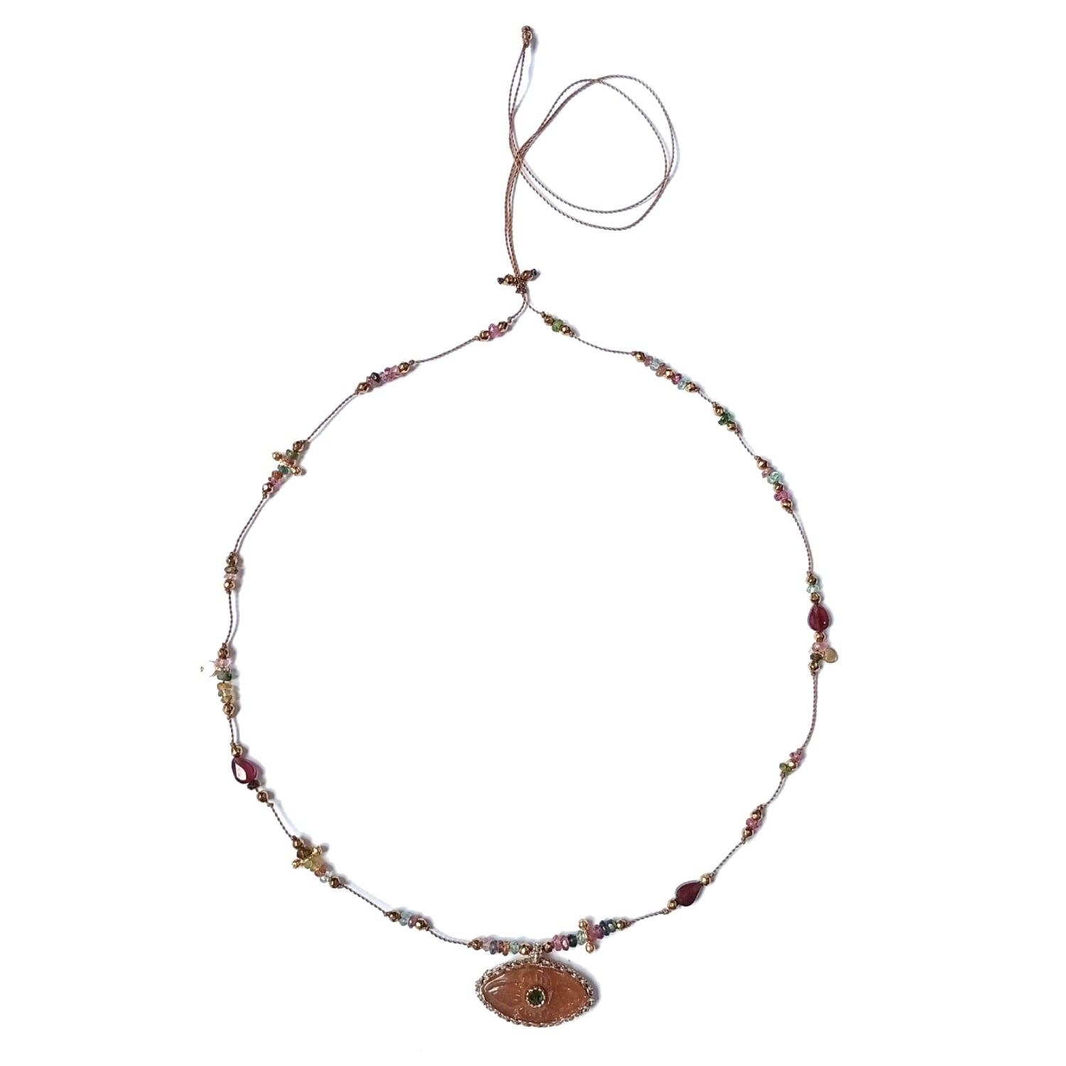 Collier avec pendentif amulette Oeil porte-bonheur en pierres fines naturelles Quartz strawberry et Diopside, serti d'un macramé en fil lurex. Mix de perles en Tourmalines multicolores et Hématite dorée, pampilles en...