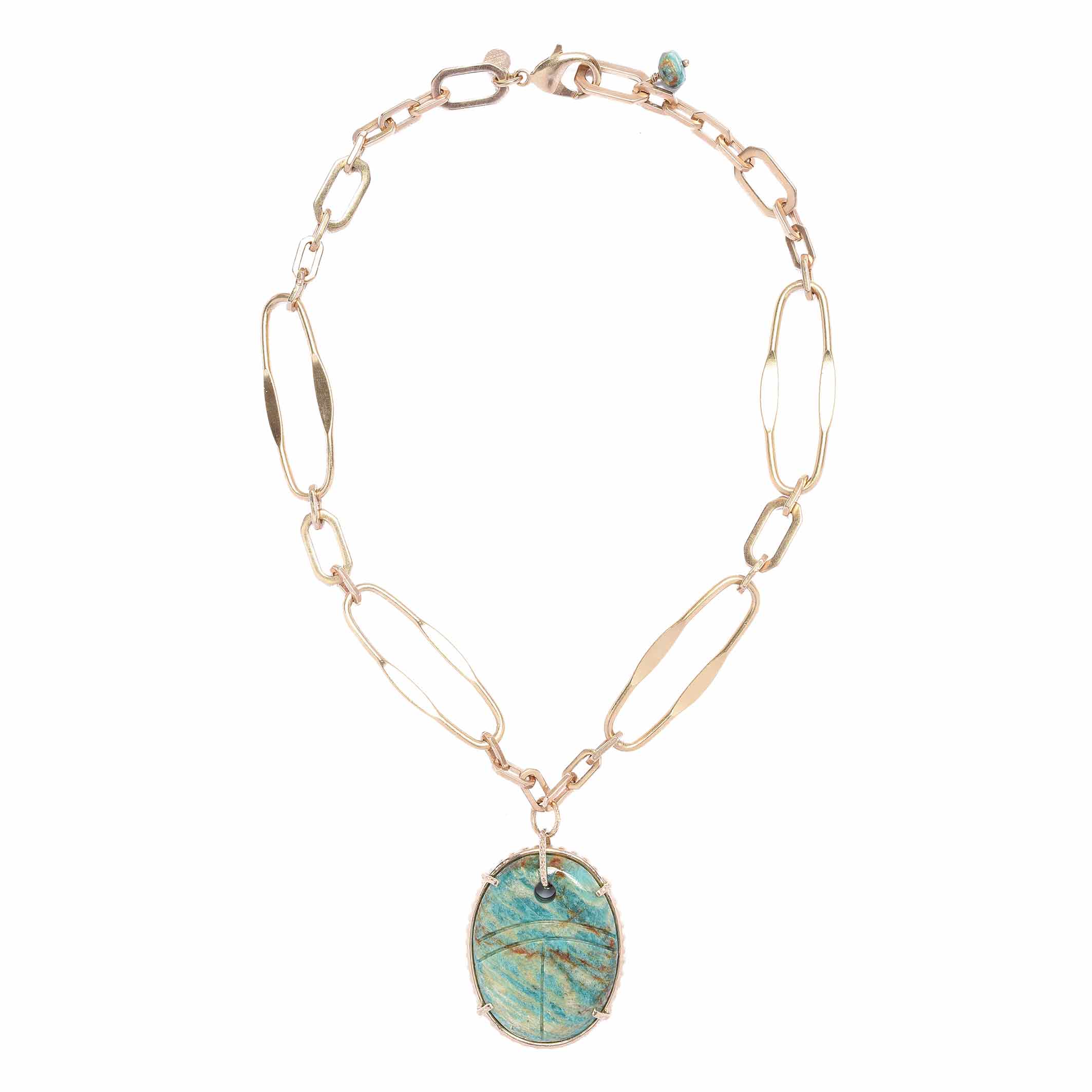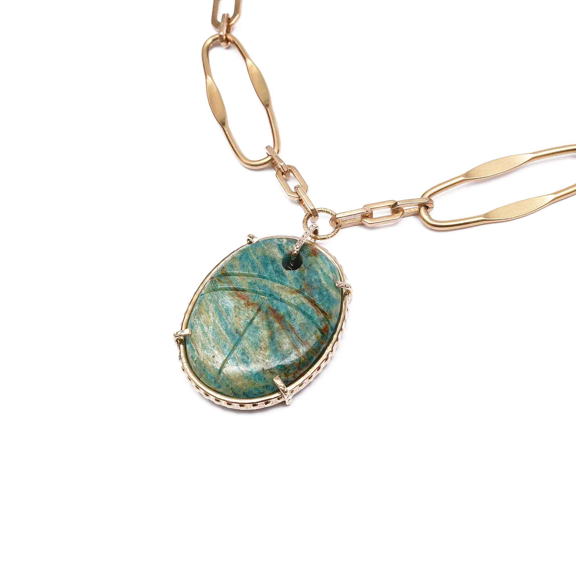 Collier avec pendentif amulette scarabée porte-bonheur sculpté en Amazonite du Pérou, chaîne en laiton doré à l'or 24 carats. Longueur réglable de 51 cm à 56 cm. Les pierres étant naturelles...