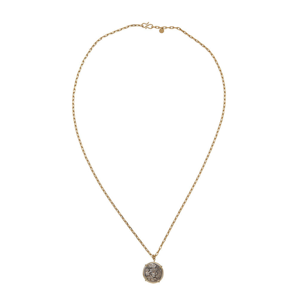 Collier avec pendentif médaille, reproduction d'une monnaie ancienne en laiton argenté, montée sur une chaîne esprit vintage en laiton doré à l'or 24 cts. Longueur env. 50 cm Nos dorures...
