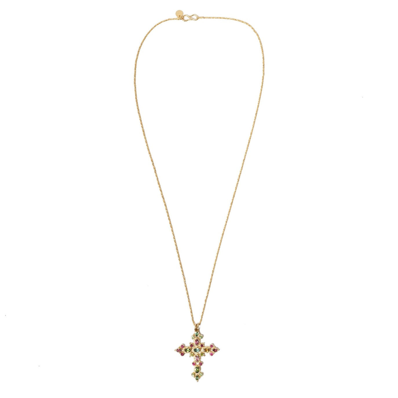 Collier avec pendentif croix en argent 925 doré à l'or 24 cts, 1 micron, sertie de pierres Tourmalines multicolores naturelles. Chaîne en argent 925 plaqué or 24 cts, 3 microns....